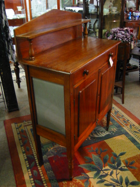 This full cedar meat safe dates from around 1850 has been fully restored and repolished. There is a lovely back story to this piece. An Italian migrant family came to Australia after the Second World War and settled in Footscray, a suburb of Melbourne. Having very little, they puchased secondhand furniture and this Australian cedar meat safe served them well, up until around the turn of the 21st century. The meat safe had been painted a few times, in situ, so much so that when it was picked up, the lino came up with it. The story goes to show that good quality antique furniture can be useful, good for the environment and good to look at. This piece features a shelf to the palladian back carried on turned supports. There is a full width drawer above two doors and it stands on turned legs. The height is 1360mm, width 915mm and the depth is 445mm.