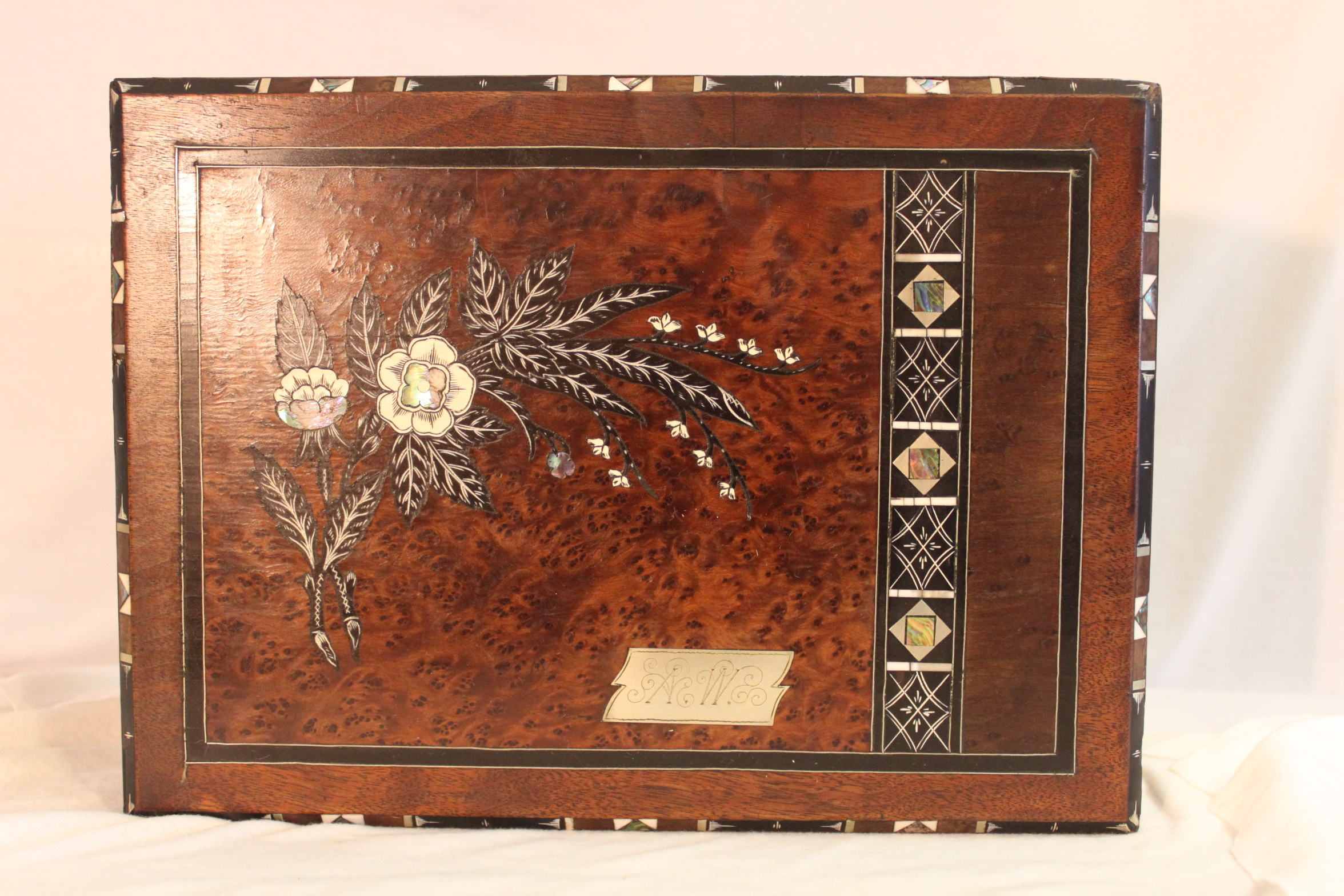 As fashion changed so did the decoration of the writing box. From the simple elegance of mahogany in the Georgian period, through to the fussiness of the Victorians, from rosewood veneer, to oak, walnut and inlays of brass and exotic timbers, and even papier mache. Sizes varied from extra large to small, with the smaller ones usually for ladies or students.
