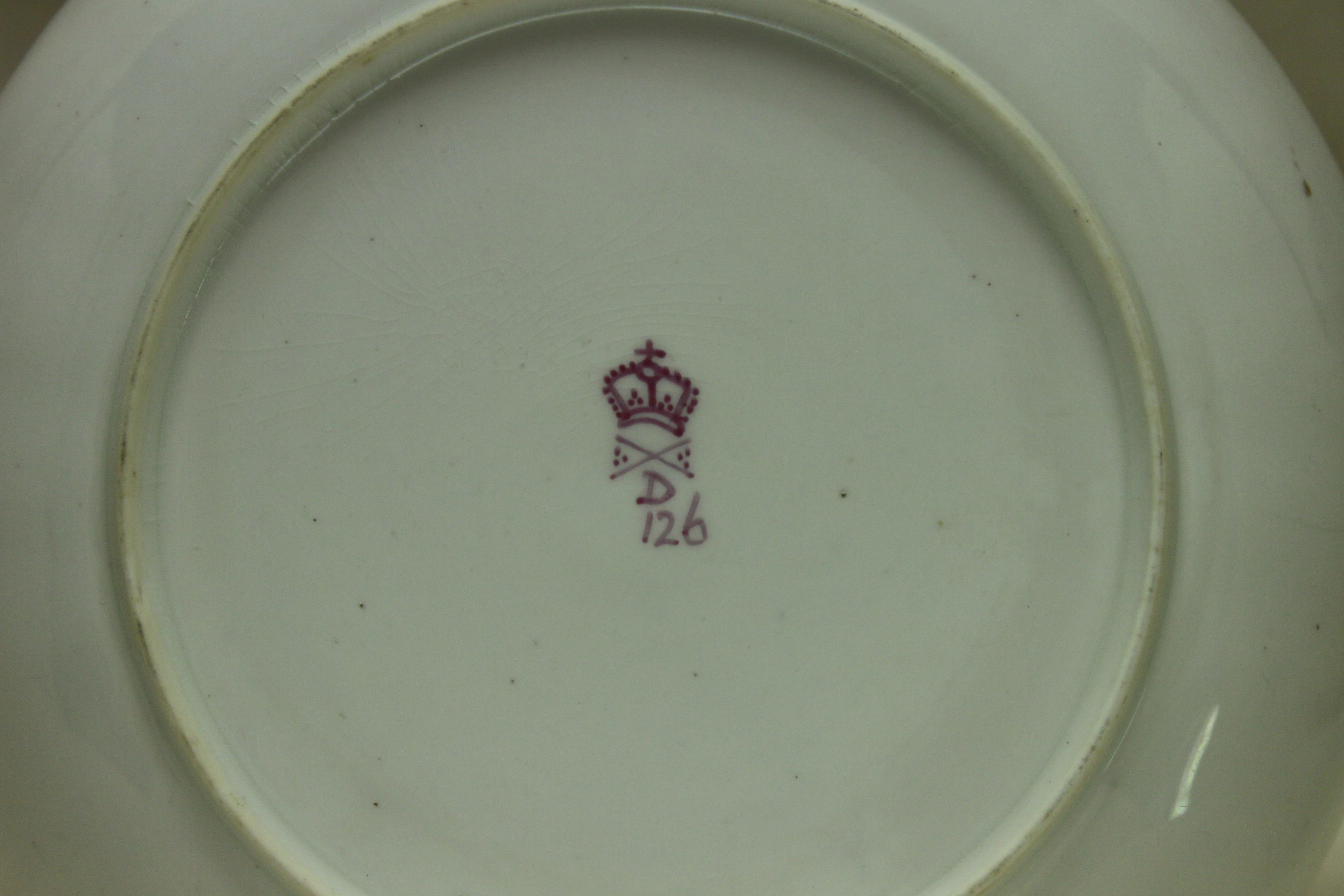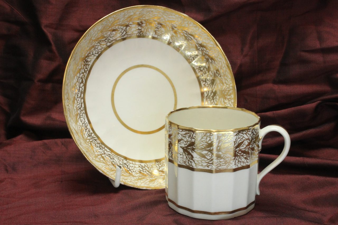 Derby hand painted and gilded trio pattern 126. Item 3931.The fluted body of this Derby hand painted and gilded trio is decorated with pattern 126 – sitting between two gilt lines there is a continuous line of dark blue ovals, each inside a gilt frame, and alternating with gilt diamonds. There is some very minor loss of gilding to the coffee cup and the saucer, whilst there is a bit more wear to the tea cup, which was obviously used more. There is also a hairline crack to the saucer. Marked with the puce Derby mark, this trio dates from around 1790.