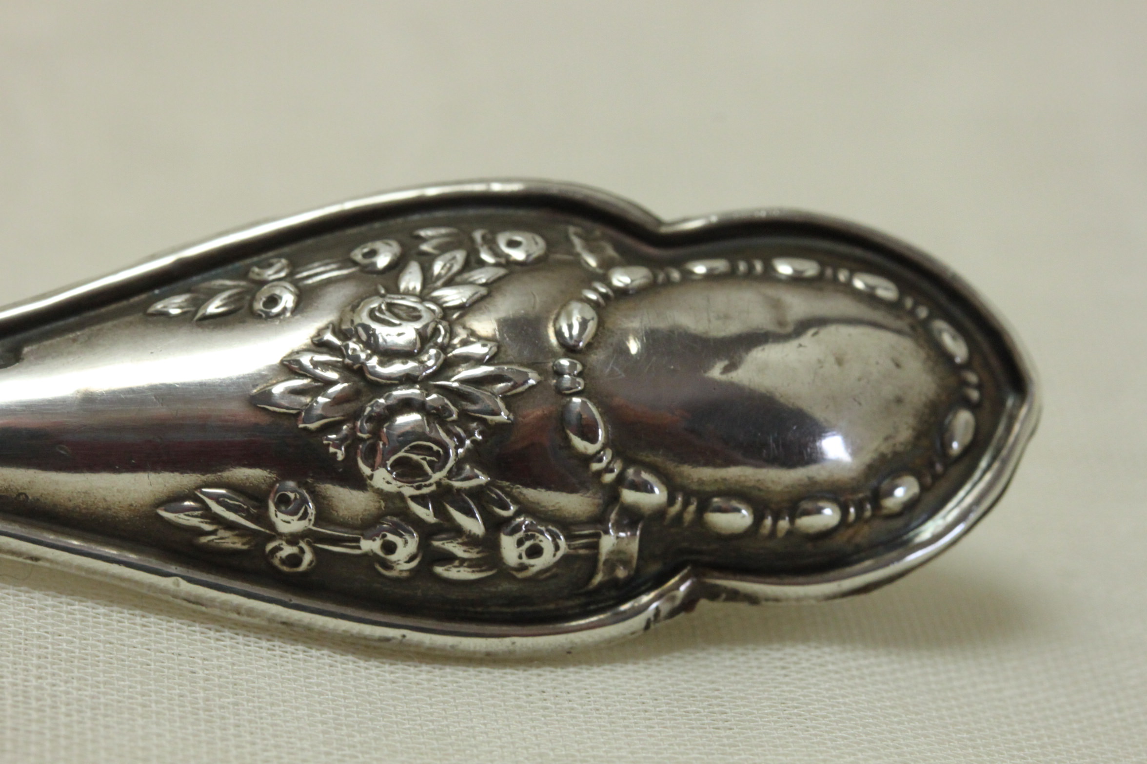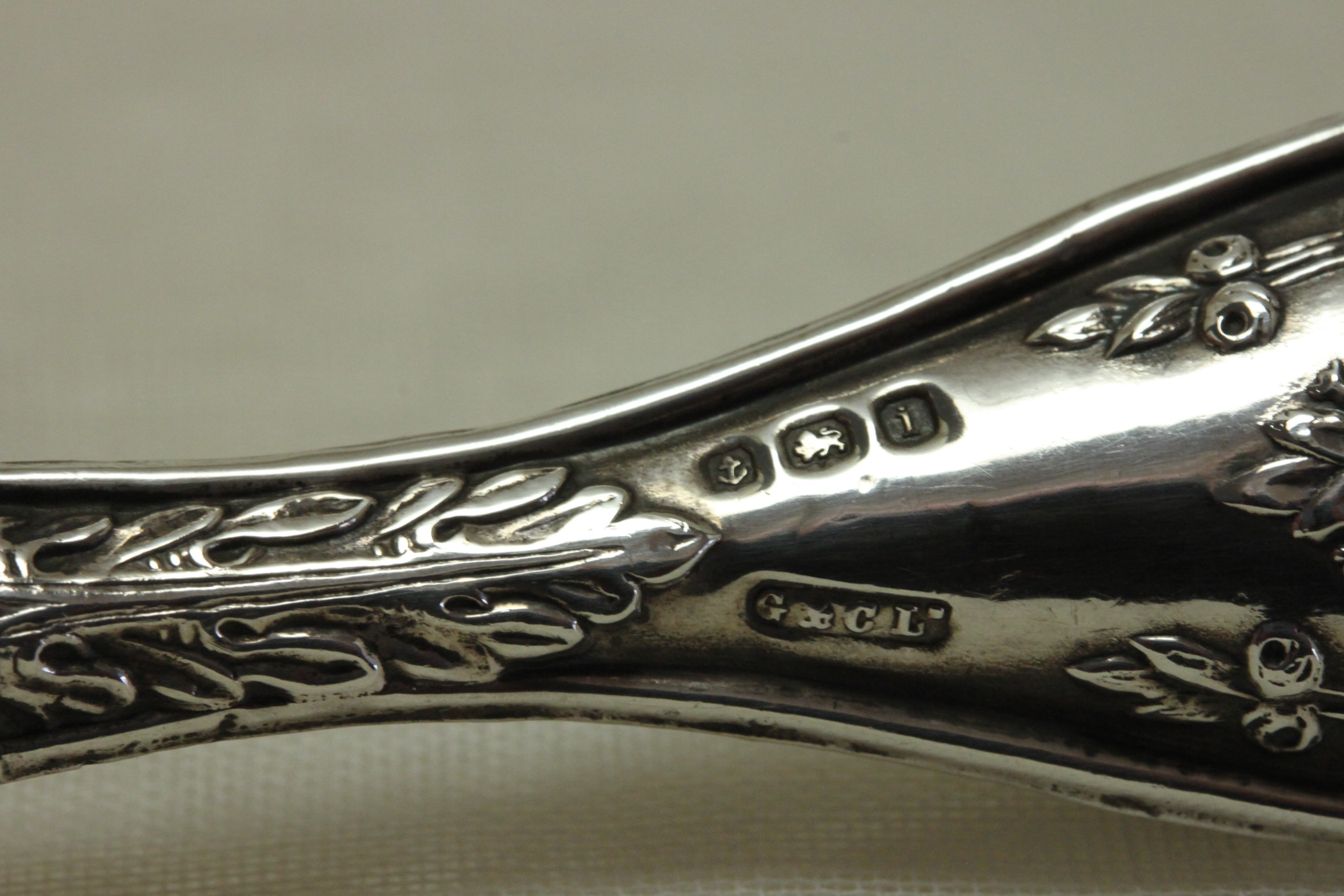 Silver handled button hook Birmingham 1908. Item 4600.This sterling silver handled button hook with a steel shank was made in Birmingham in 1908, by Green and Cadbury. The handle is decorated with roses, an oval garland and stylised acanthus leaves. It measures 203 mm (8 inches) in length, and is in very good condition.