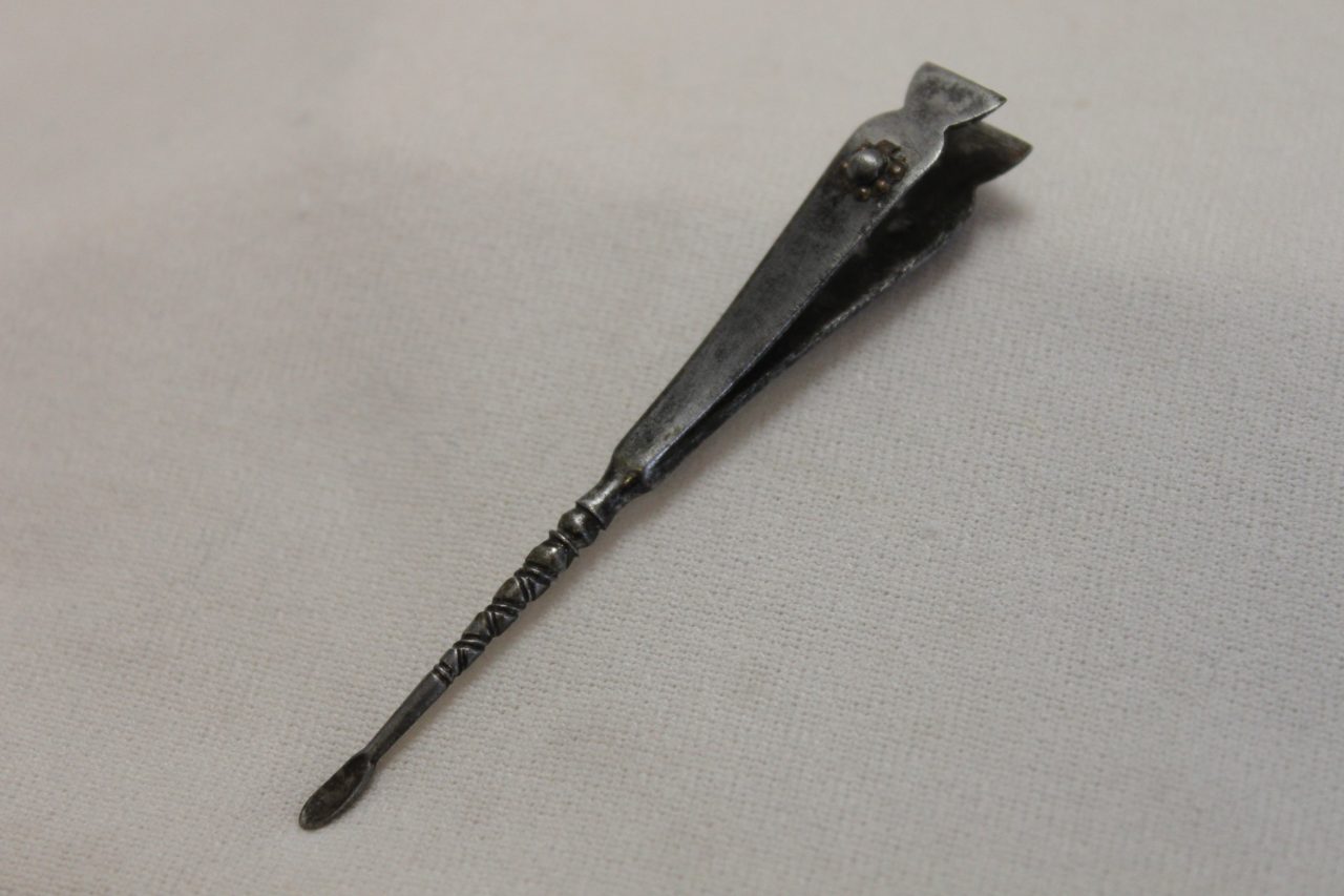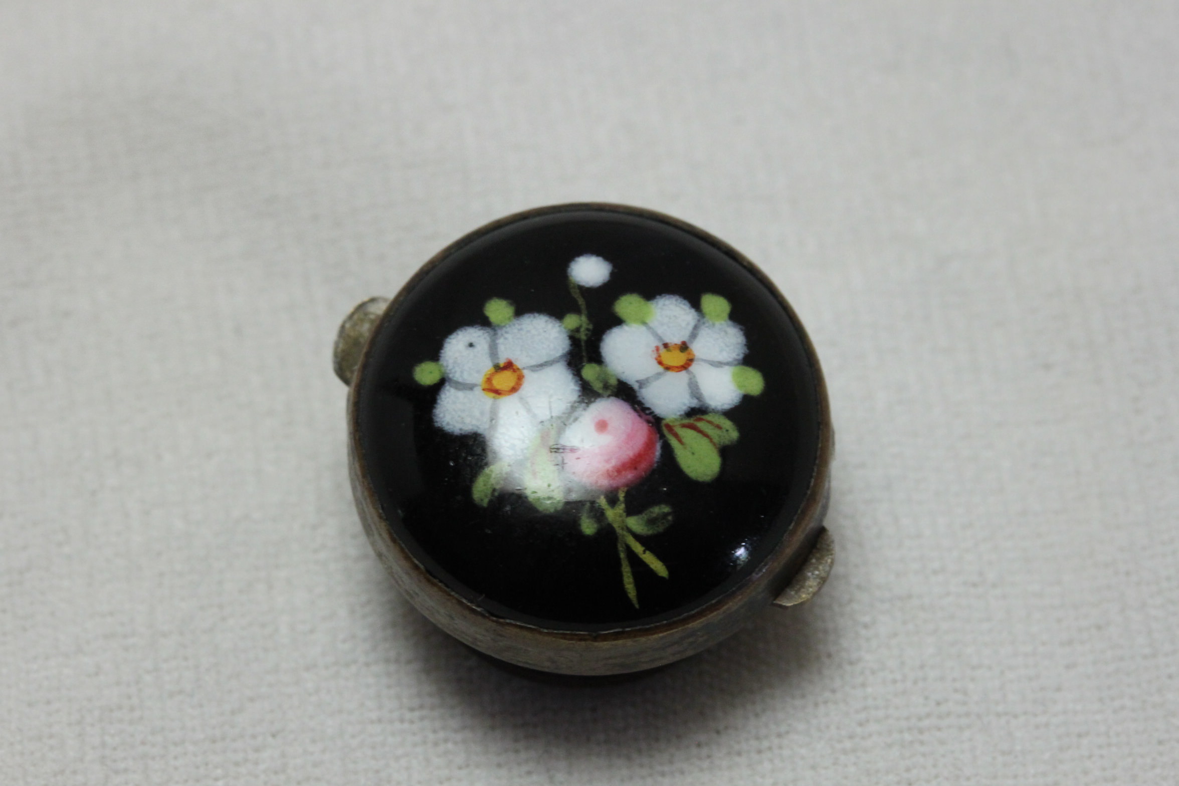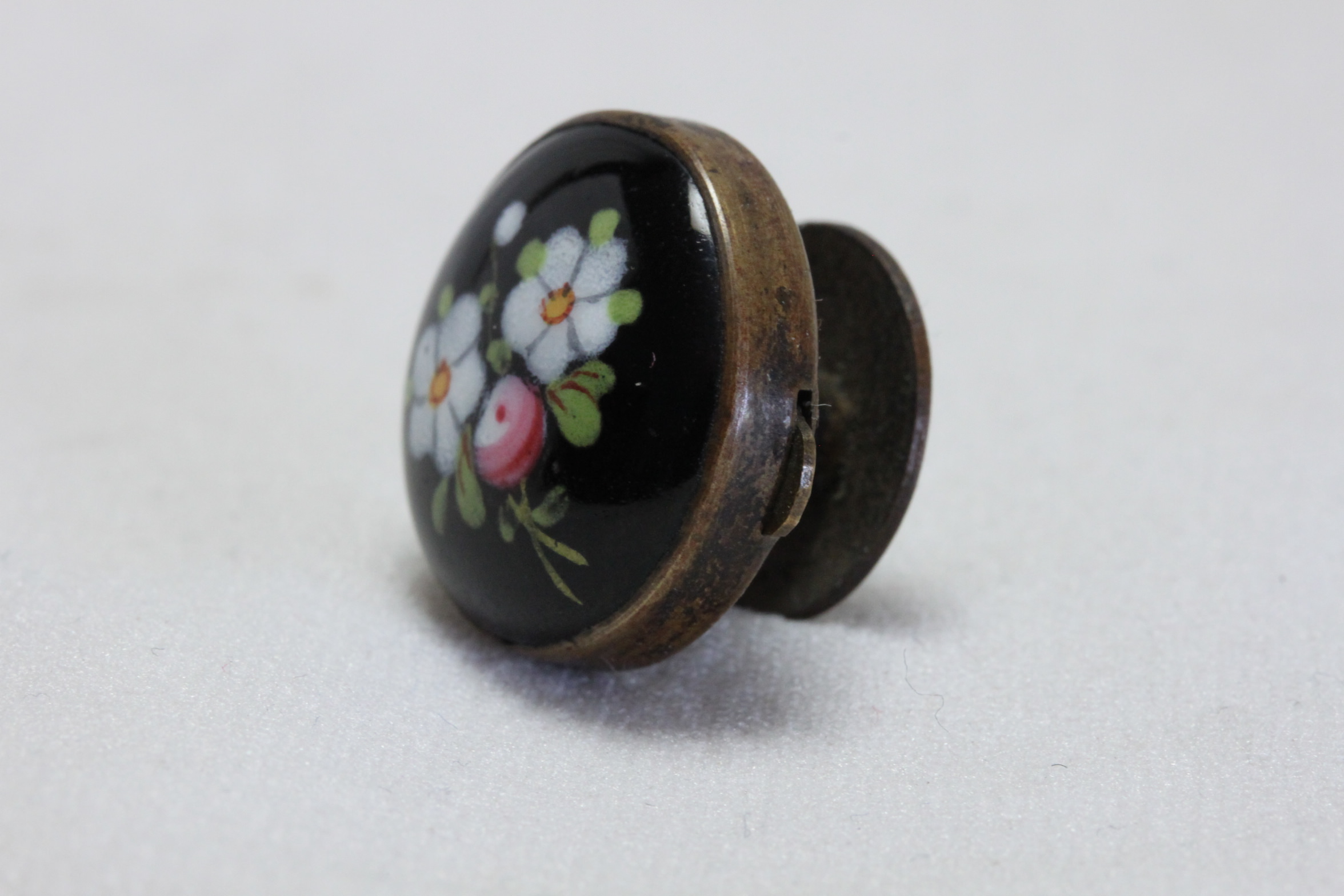 Solitaire or Bachelor’s Button. Item 4588.This Solitaire or Bachelor’s Button is decorated with a domed black glass centre that has been painted with a spray of flowers, and mounted in brass. The two spring mounted side wings depress to release the back stud, and these were used as shirt buttons or to fasten collars to shirts. They were very popular during the period 1870-90. It was made by Greaves -“Greaves Patent”- one of the better makers. This one has a diameter of 19 mm or 3/4trs of an inch. It is in very good condition.