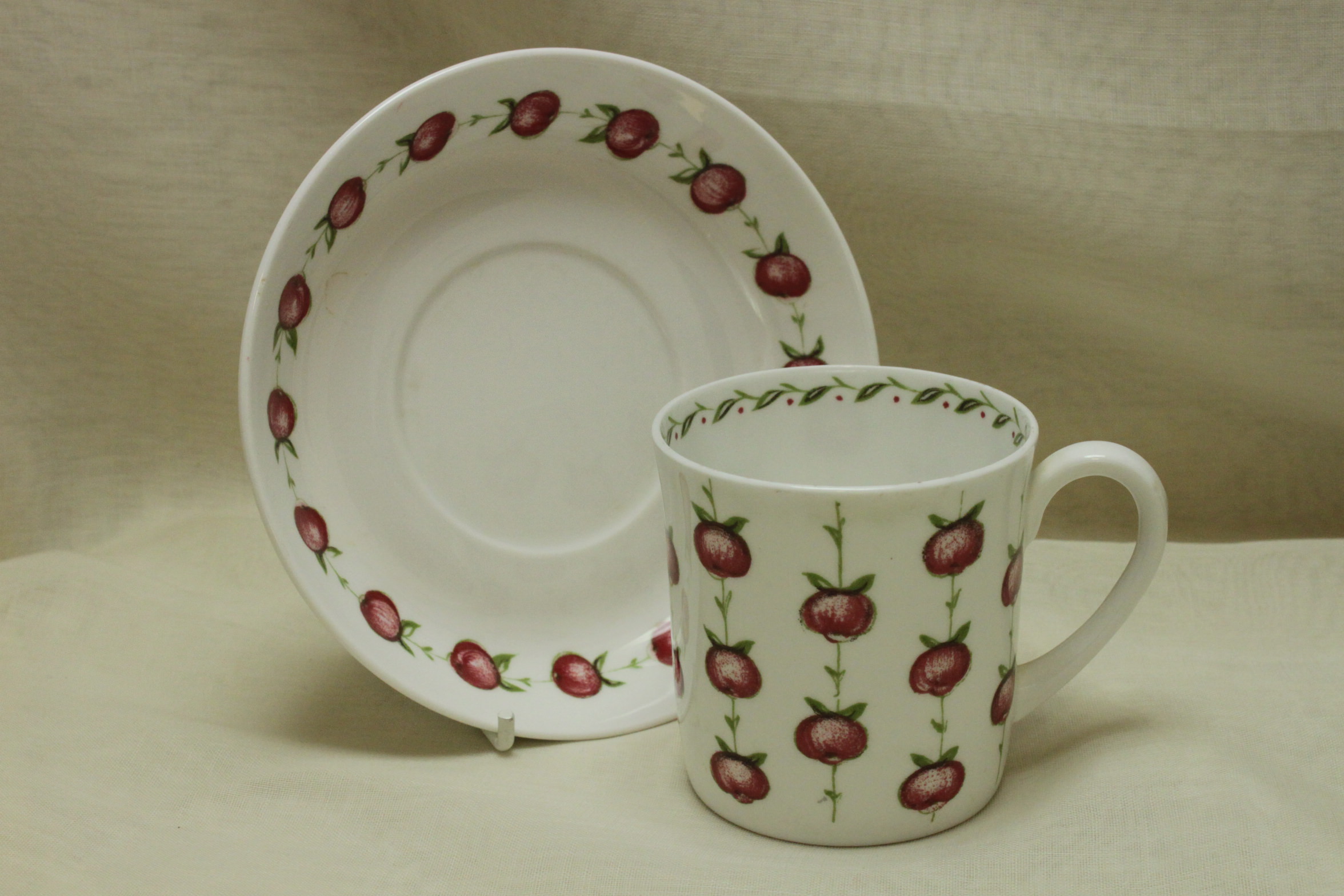 Susie Cooper set of 6 coffee cups & saucers Apple Gay pattern. Item 4606.This set of 6 coffee cups & saucers by Susie Cooper is decorated with the very attractive Apple Gay pattern (pattern C 2018), which was introduced in the early 1960’s. The pattern was popular for a long time, with this set manufactured before March 1966, pre-dating the takeover by Wedgwood. The set is in very good condition with no chips or cracks.