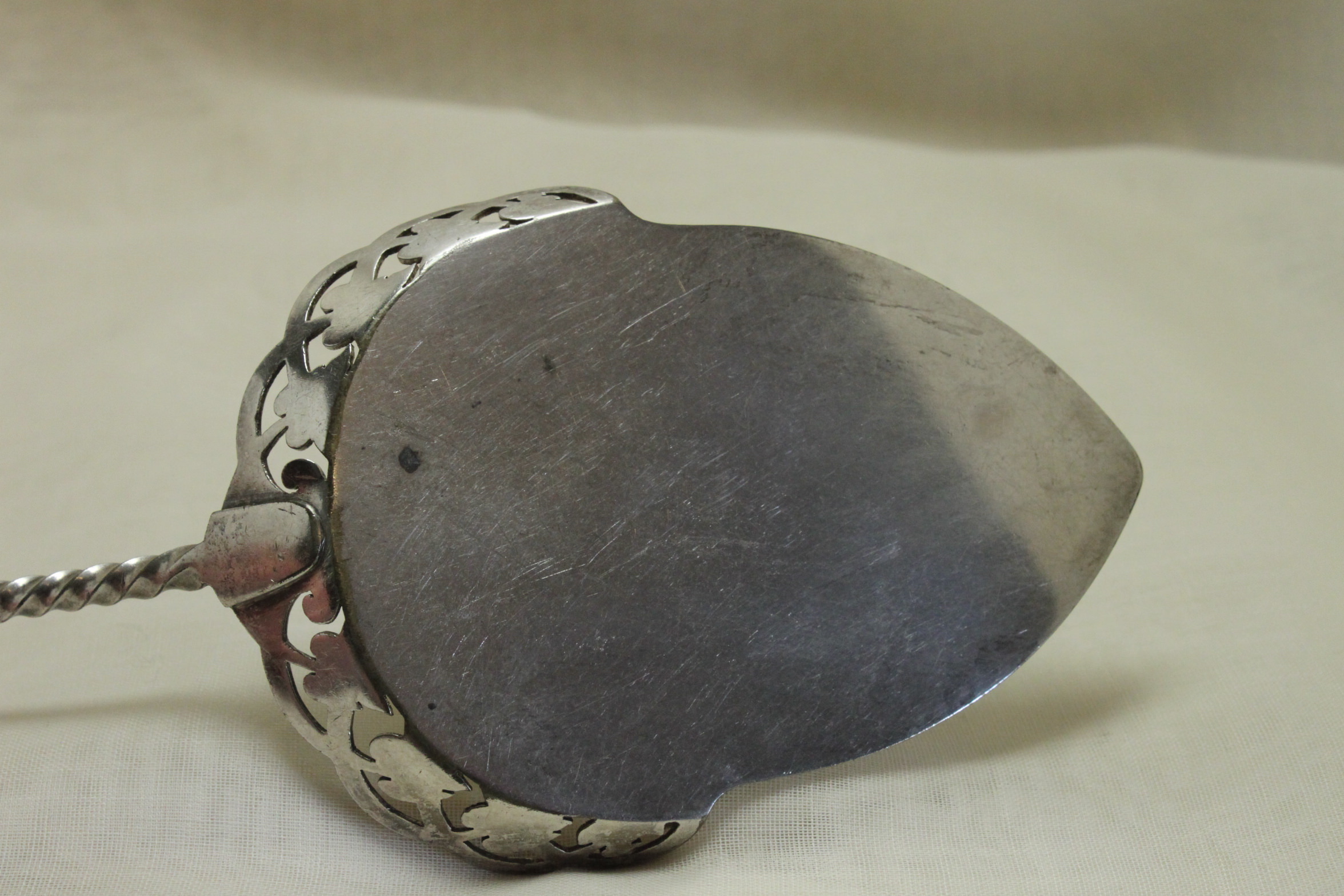 Victorian engraved silver plated cake or dessert slice. Item 4603.This beautifully pierced and engraved silver plated cake or dessert slice measures 242 mm (9.5 inches) in length, and 88 mm (3.5 inches) in width. It is very good quality and stamped with the maker’s mark B & H, but it is not known who they are. It is in very good condition and would date from around 1880.